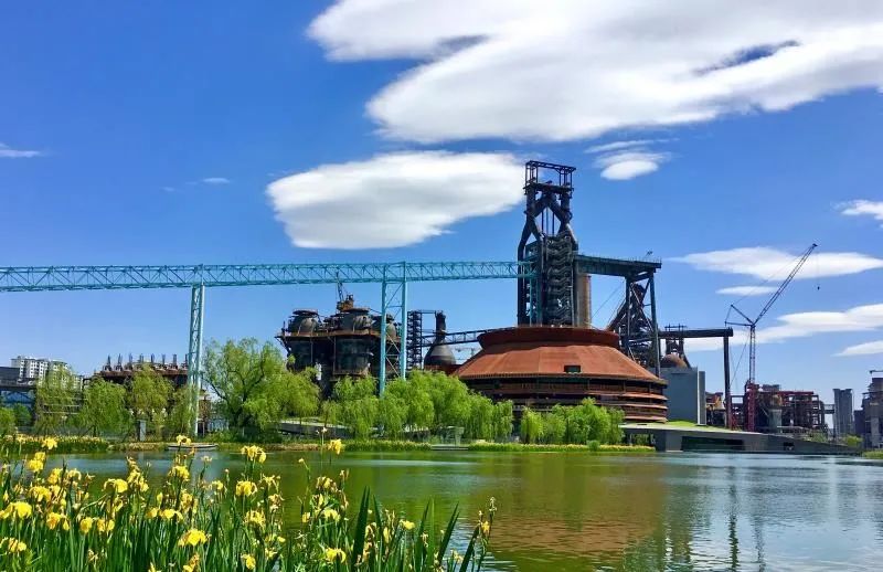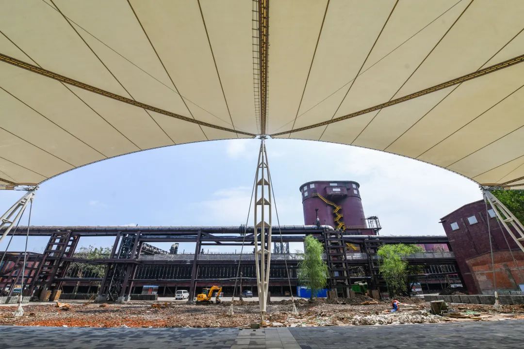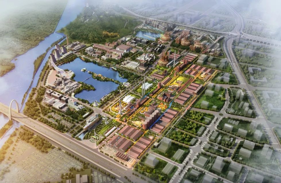 工业遗址公园南侧的原有建筑被保留作为特色工业遗存景观。贯通整个园区的工业设施将作为景观大道两侧的主要工业遗存予以保留。原有除尘车间、泵站及冷却塔等都已完成结构加固改造及二次砌筑和室内精装修,作为餐饮、办公室等服务配套设施。