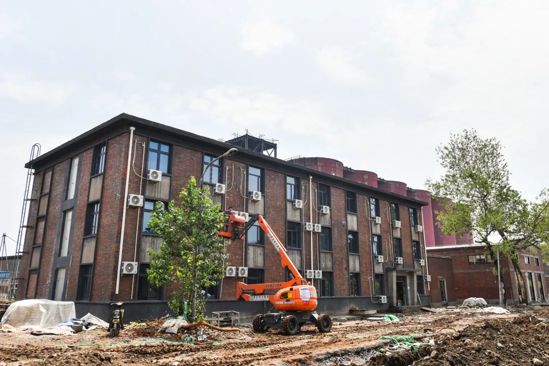 “修旧如旧”是设计人员改造工业遗存时坚持的理念。工业遗址公园区域共有30余处需要改造的设施,包括厂房、转运站、筒仓等,技术人员首先对建筑进行“体检”,进行结构检测鉴定、消除安全隐患后再开展加固改造施工。工业厂房外墙用高压水枪冲刷后露出里面的红砖,工人再涂刷透明保护漆,呈现出斑驳的老工业痕迹。