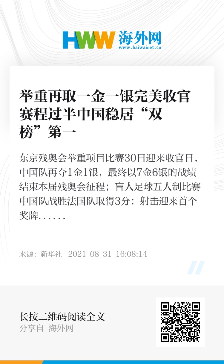 新华社东京8月30日电(记者赵建通、董意行、胡佳丽)东京残奥会举重项目比赛30日迎来收官日,中国队再夺1金1银,最终以7金6银的战绩结束本届残奥会征程;盲人足球五人制比赛中国队战胜法国队取得3分;射击迎来首个奖牌日,中国选手取得1金1银。中国代表团当天共夺得8金6银1铜,总共已经收获54金35银30铜。赛程过半,中国代表团在金牌榜、奖牌榜上均稳居第一。