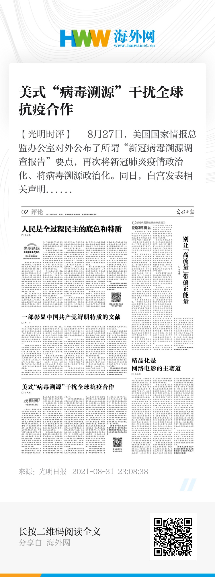 美将病毒溯源政治化,由情报部门进行“调查”,其本身就是对科学精神的最大亵渎。毫无疑问,要最终战胜新冠肺炎疫情,就需要对其展开严谨的科学研究,其中当然也包括对于病毒起源的研究。众所周知,世界卫生组织与中国于今年年初顺利且成功地合作进行了由多国专家参与的联合科学研究,为后续相关研究树立了典范。反观美国的所谓“溯源”以及一系列将疫情政治化的行径,都是惯于“撒谎、欺骗、盗窃”的美国情报机构的捕风捉影、东拼西凑、通过胁迫科学界人士的恶意捏造,毫不具备任何科学研究基础,完全是有罪推定的政治构陷,充斥着用心险恶的政治诱导性。
