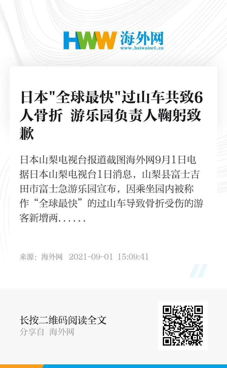 海外网9月1日电 据日本山梨电视台1日消息,山梨县富士吉田市富士急游乐园宣布,因乘坐园内被称作“全球最快”的过山车导致骨折受伤的游客新增两人,他们都需接受30天以上治疗。园方负责人召开记者会鞠躬致歉。该过山车至此已致6人骨折。
