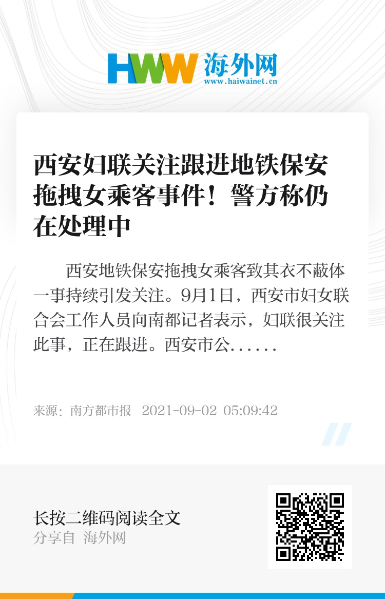 西安地铁保安拖拽女乘客致其衣不蔽体一事持续引发关注。9月1日,西安市妇女联合会工作人员向南都记者表示,妇联很关注此事,正在跟进。西安市公安局地铁分局工作人员告诉南都记者,此前已接到报警,仍在处理中。