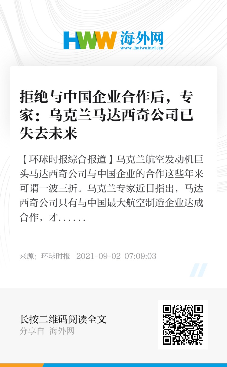 【环球时报综合报道】乌克兰航空发动机巨头马达西奇公司与中国企业的合作这些年来可谓一波三折。乌克兰专家近日指出,马达西奇公司只有与中国最大航空制造企业达成合作,才有可能有未来。但是,现在它没有未来了。