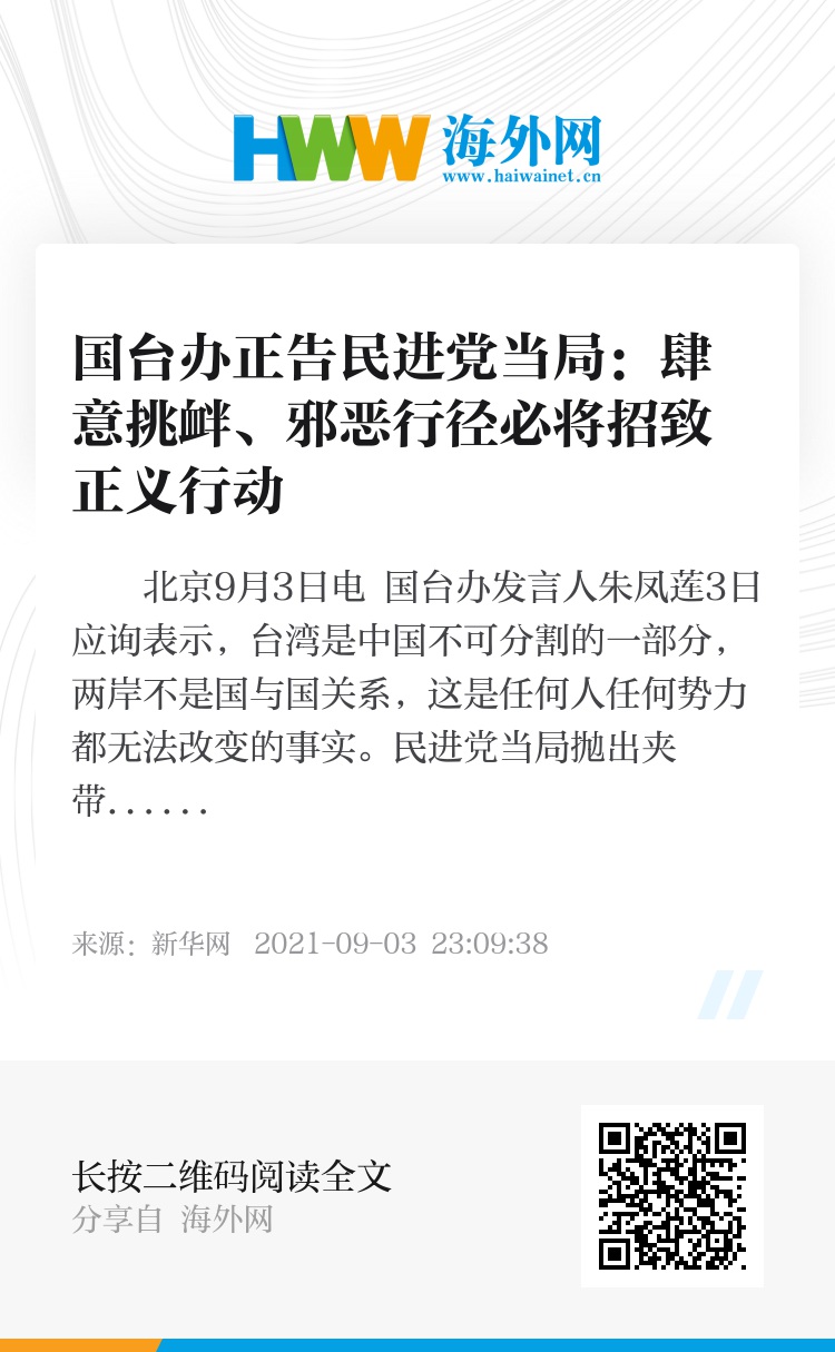 她还表示,我们正告民进党当局,肆意的挑衅,邪恶的行径,必将招致正义的行动。