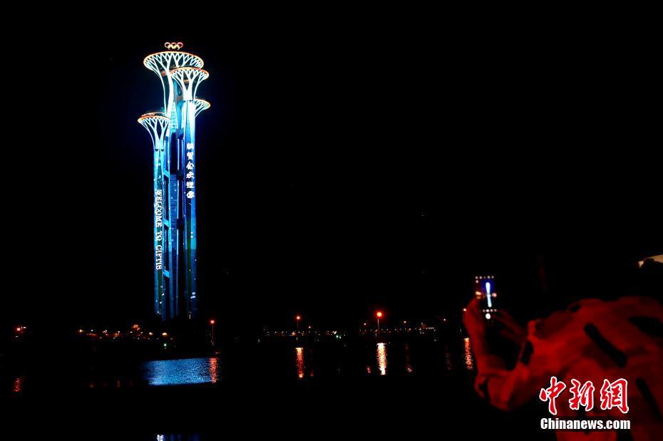 北京奥林匹克塔亮起“服贸会”主题灯光