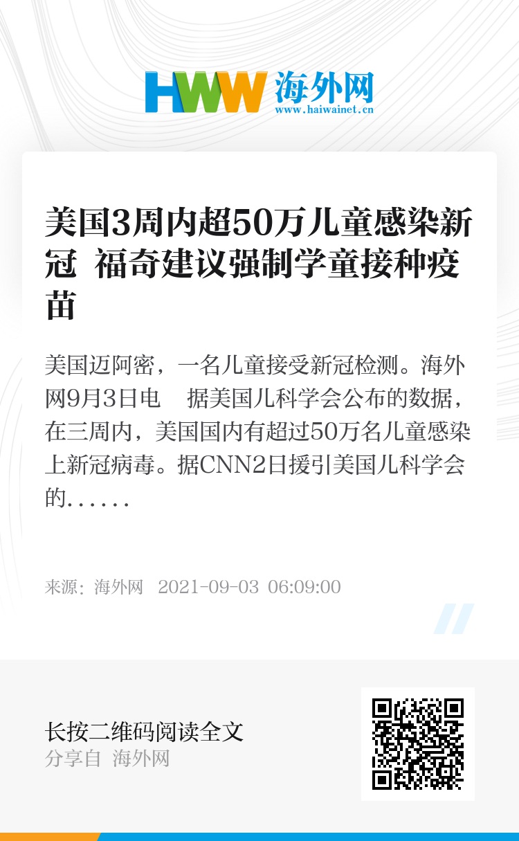 海外网9月3日电 据美国儿科学会公布的数据,在三周内,美国国内有超过50万名儿童感染上新冠病毒。
