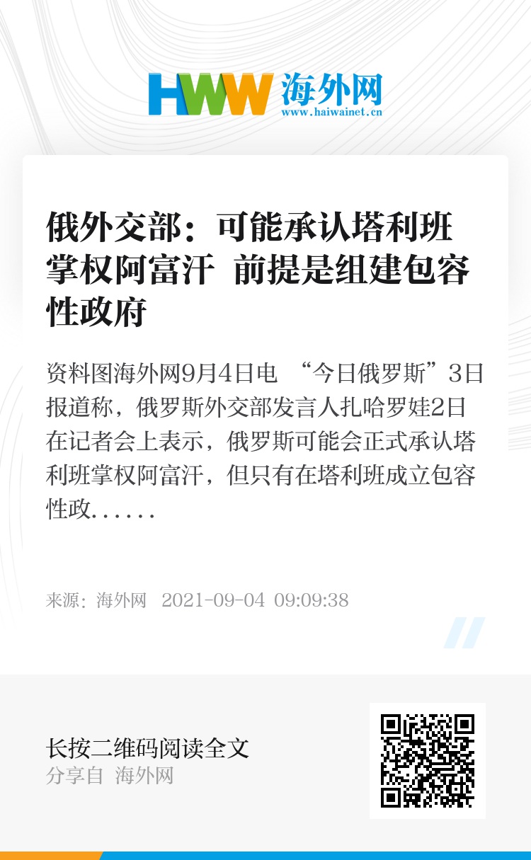 海外网9月4日电 “今日俄罗斯”3日报道称,俄罗斯外交部发言人扎哈罗娃2日在记者会上表示,俄罗斯可能会正式承认塔利班掌权阿富汗,但只有在塔利班成立包容性政府后,才会适当考虑这一举动。