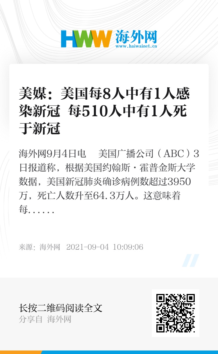 海外网9月4日电 美国广播公司(ABC)3日报道称,根据美国约翰斯·霍普金斯大学数据,美国新冠肺炎确诊病例数超过3950万,死亡人数升至64.3万人。这意味着每8名美国人中有1人感染新冠病毒,每510名美国人中1人死于新冠病毒。