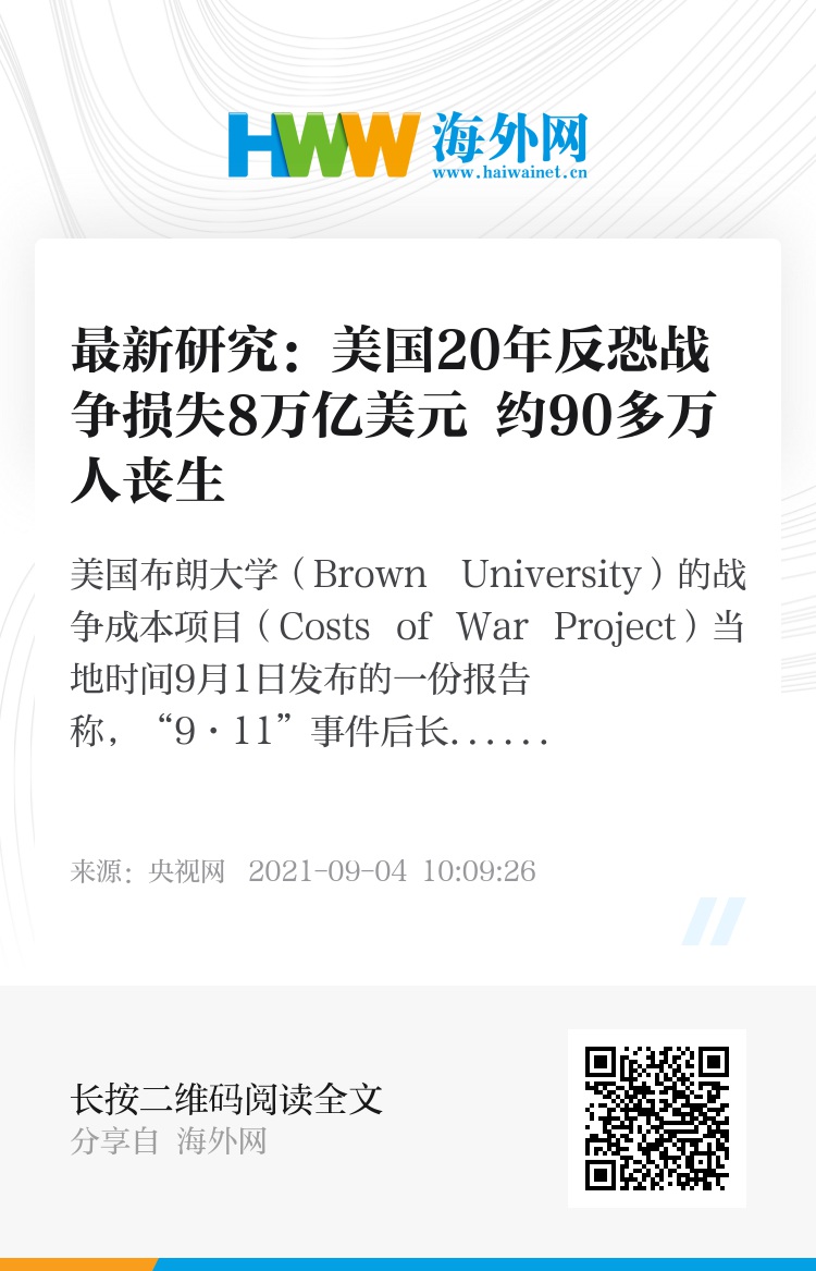 美国布朗大学(Brown University)的战争成本项目(Costs of War Project)当地时间9月1日发布的一份报告称,“9·11”事件后长达20年的战争已经使美国损失了大约8万亿美元,导致约90多万人丧生。