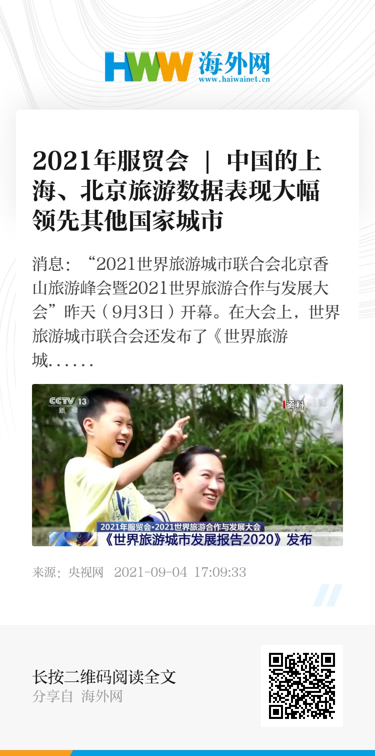 央视网消息:“2021世界旅游城市联合会北京香山旅游峰会暨2021世界旅游合作与发展大会”昨天(9月3日)开幕。在大会上,世界旅游城市联合会还发布了《世界旅游城市发展报告2020》和《世界旅游城市未来发展议程(2021-2030)》两个最新研究成果。《世界旅游城市发展报告2020》全面介绍和总结了世界主要旅游城市2020年的发展状况,并提出了未来世界旅游城市的发展目标和行动计划,而制定《世界旅游城市未来发展议程(2021-2030)》,以期推动和指导世界旅游城市实现可持续发展。