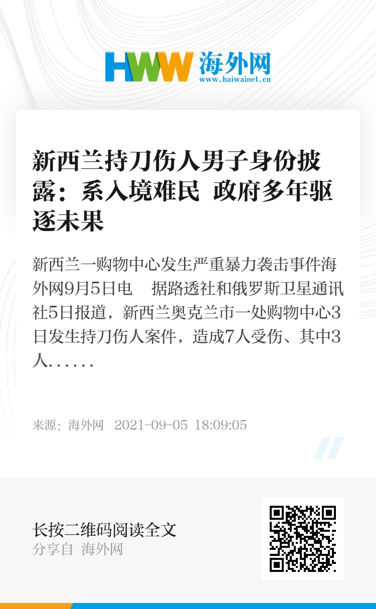 海外网9月5日电 据路透社和俄罗斯卫星通讯社5日报道,新西兰奥克兰市一处购物中心3日发生持刀伤人案件,造成7人受伤、其中3人重伤,嫌疑人艾哈迈德·萨姆苏丁被警方当场击毙。
