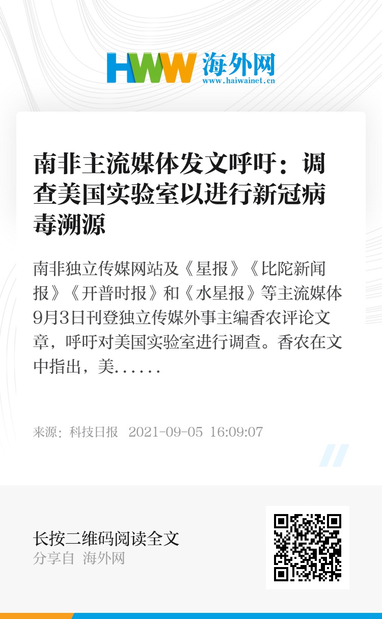 南非独立传媒网站及《星报》《比陀新闻报》《开普时报》和《水星报》等主流媒体9月3日刊登独立传媒外事主编香农评论文章,呼吁对美国实验室进行调查。