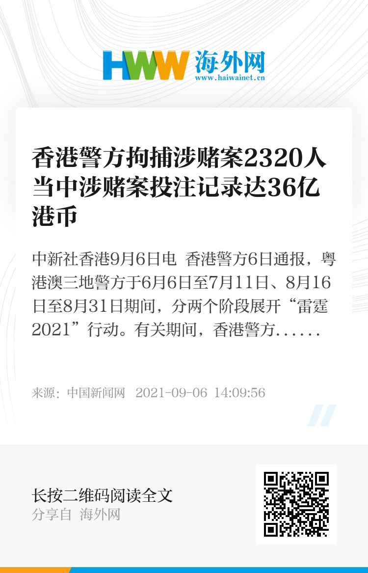 中新社香港9月6日电 香港警方6日通报,粤港澳三地警方于6月6日至7月11日、8月16日至8月31日期间,分两个阶段展开“雷霆2021”行动。有关期间,香港警方共拘捕2320人,当中涉赌案投注记录达36亿元(港币,下同)。