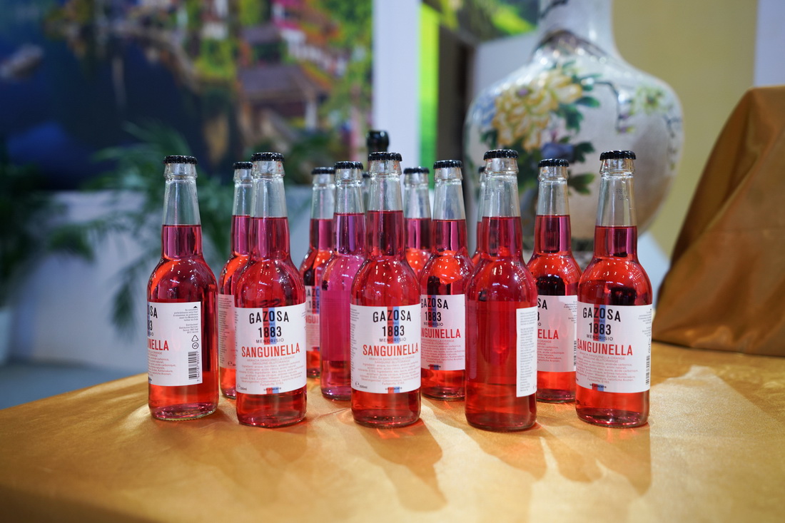 这是9月5日在服贸会国家会议中心国别展区瑞士展台拍摄的气泡水。