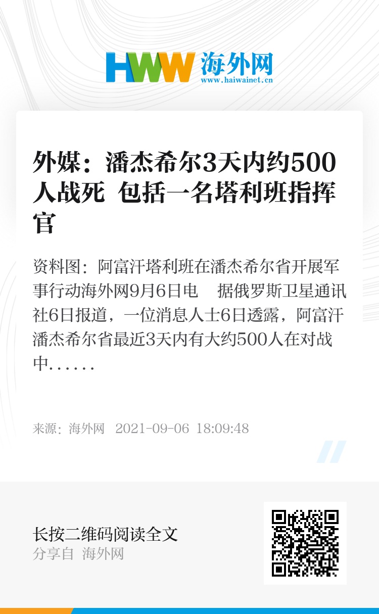 海外网9月6日电 据俄罗斯卫星通讯社6日报道,一位消息人士6日透露,阿富汗潘杰希尔省最近3天内有大约500人在对战中丧生,其中既有塔利班成员也有反塔力量“全国抵抗阵线”(NRF)的士兵。