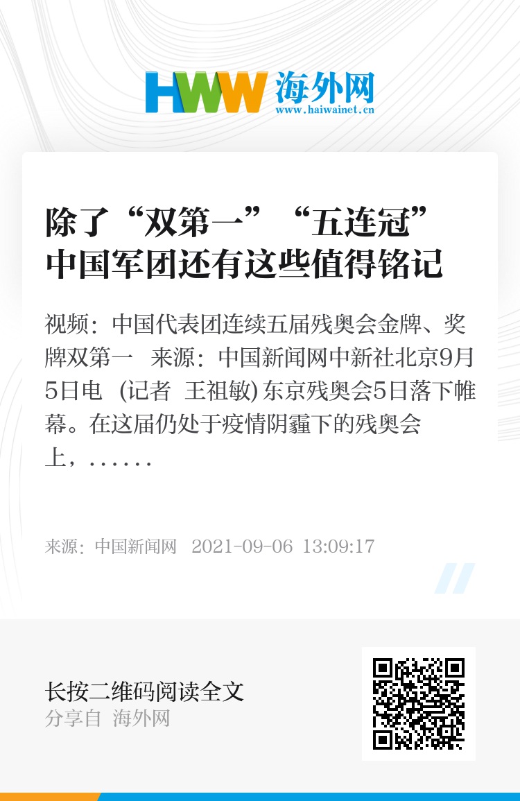中新社北京9月5日电 (记者 王祖敏)东京残奥会5日落下帷幕。在这届仍处于疫情阴霾下的残奥会上,中国代表团除了以优异成绩实现了残奥会金牌和奖牌的双第一及五连冠外,还有这些值得被铭记: