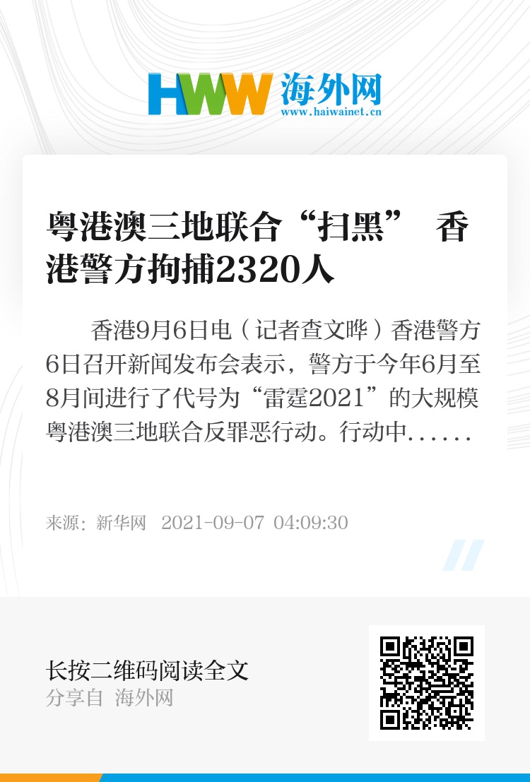 新华社香港9月6日电(记者查文晔)香港警方6日召开新闻发布会表示,警方于今年6月至8月间进行了代号为“雷霆2021”的大规模粤港澳三地联合反罪恶行动。行动中,香港警方共拘捕2320人,检获的现金、毒品和涉及非法活动的货物总值约3.9亿港元,另外检获非法投注记录约36亿港元。