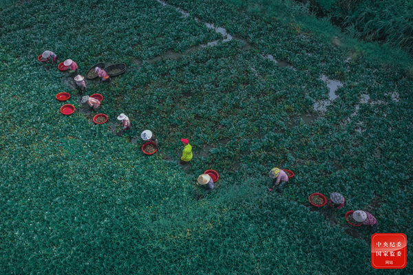 菱叶菱花贴水生,菱湖十里棹歌声。采菱农家划着菱桶,穿梭在长满绿色菱叶的河面上采摘菱角,享受着丰收的喜悦与幸福。(福建省莆田市城厢区纪委监委供 林沁 摄)