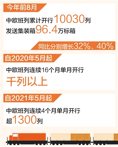 数据显示,今年前8月,中欧班列累计开行10030列,发送集装箱96.4万标箱,同比分别增长32%、40%,往返综合重箱率达97.9%,较去年提前2个月实现年度开行过万列。