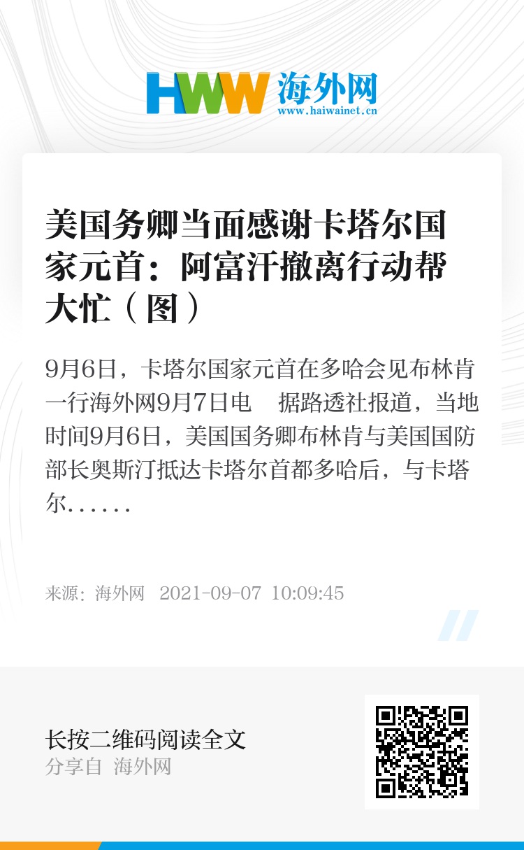 美国国务院声明称,布林肯感谢卡塔尔在从阿富汗撤离时“为保证美国公民、我们的伙伴和其他处于险境中的阿富汗人安全过境提供的非凡支持”。双方还“讨论了其他双边问题”。