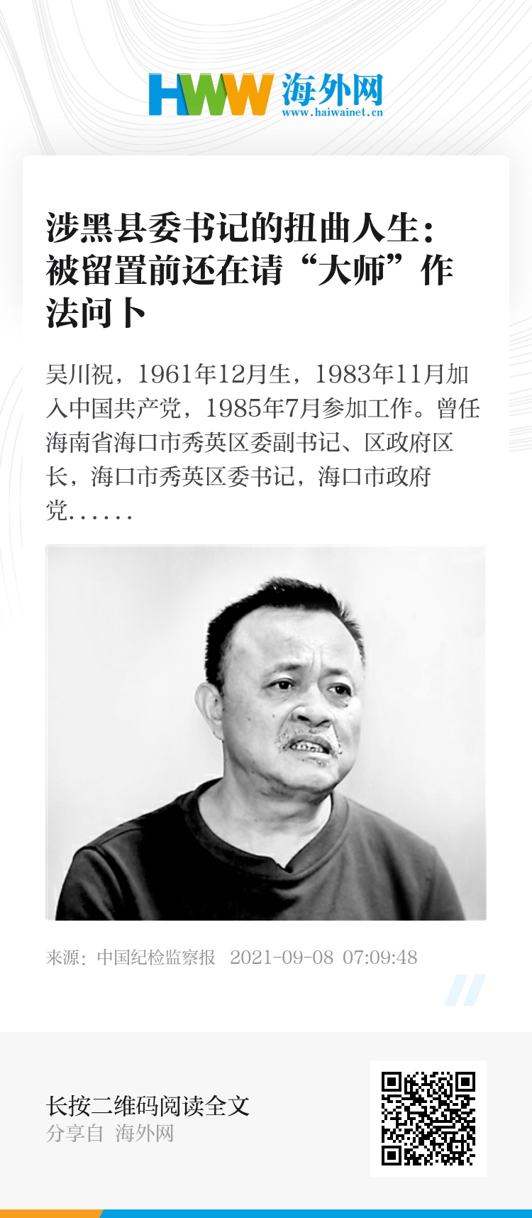 2020年6月初,吴川祝因家犬在其祖宅的灶台里难产而亡,心觉不对劲,便请“大师”作法问卜,求化解之策。6月22日,吴川祝被留置。“这是凶兆未化解啊!”这位有着37年党龄的县委书记在被留置时,仍执迷不悟,令人啼笑皆非。