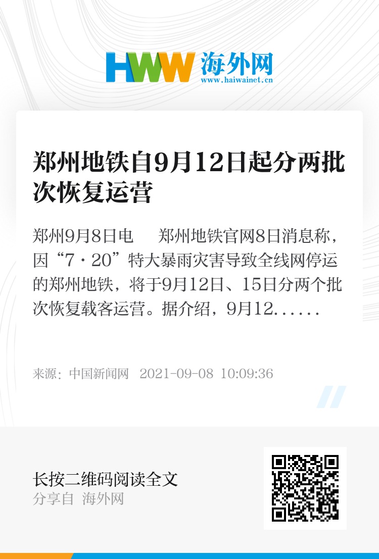 中新网郑州9月8日电 郑州地铁官网8日消息称,因“7·20”特大暴雨灾害导致全线网停运的郑州地铁,将于9月12日、15日分两个批次恢复载客运营。