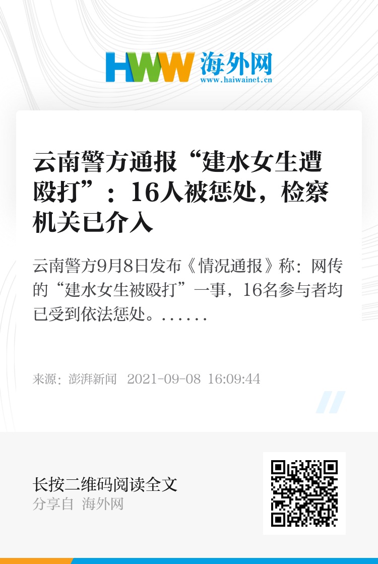 云南警方9月8日发布《情况通报》称:网传的“建水女生被殴打”一事,16名参与者均已受到依法惩处。