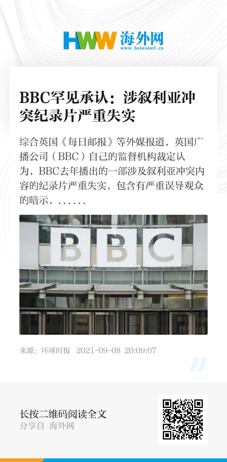 综合英国《每日邮报》等外媒报道,英国广播公司(BBC)自己的监督机构裁定认为,BBC去年播出的一部涉及叙利亚冲突内容的纪录片严重失实,包含有严重误导观众的暗示,不符合BBC倡导的“准确性”新闻标准。