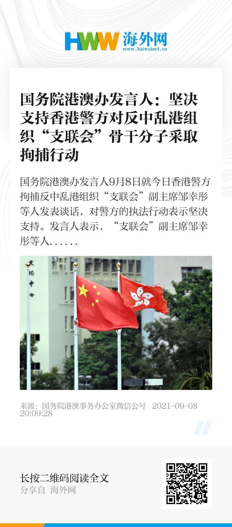 国务院港澳办发言人9月8日就今日香港警方拘捕反中乱港组织“支联会”副主席邹幸彤等人发表谈话,对警方的执法行动表示坚决支持。