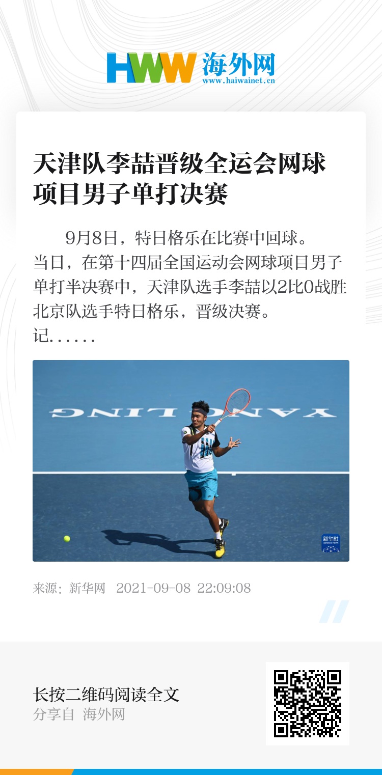 当日,在第十四届全国运动会网球项目男子单打半决赛中,天津队选手李喆以2比0战胜北京队选手特日格乐,晋级决赛。