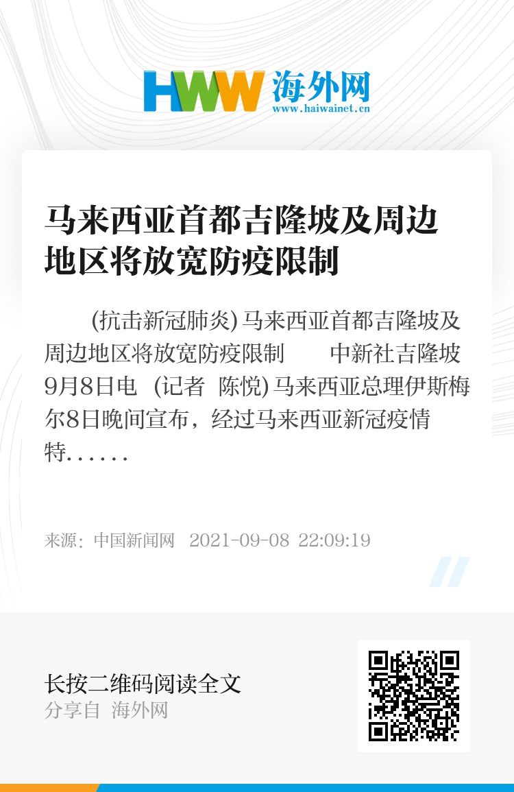 中新社吉隆坡9月8日电 (记者 陈悦)马来西亚总理伊斯梅尔8日晚间宣布,经过马来西亚新冠疫情特别委员会8日开会决定,位置相邻的该国首都吉隆坡、行政首都普特拉贾亚及雪兰莪州从本月10日起将自国家复苏计划首阶段晋级至第二阶段,放宽防疫限制。