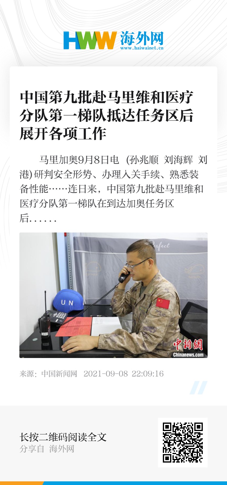 中新网马里加奥9月8日电 (孙兆顺 刘海辉 刘港)研判安全形势、办理入关手续、熟悉装备性能……连日来,中国第九批赴马里维和医疗分队第一梯队在到达加奥任务区后,进行为期2周的医学隔离,按照“工作不间断、制度先运行、状态快调整”的思路,各项工作稳步推进。
