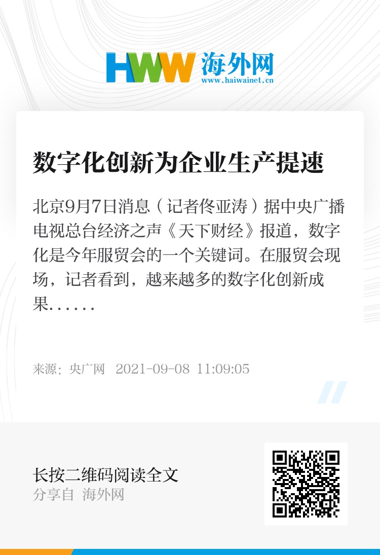 央广网北京9月7日消息(记者佟亚涛)据中央广播电视总台经济之声《天下财经》报道,数字化是今年服贸会的一个关键词。在服贸会现场,记者看到,越来越多的数字化创新成果应用到企业生产中,为企业生产、经营提速。