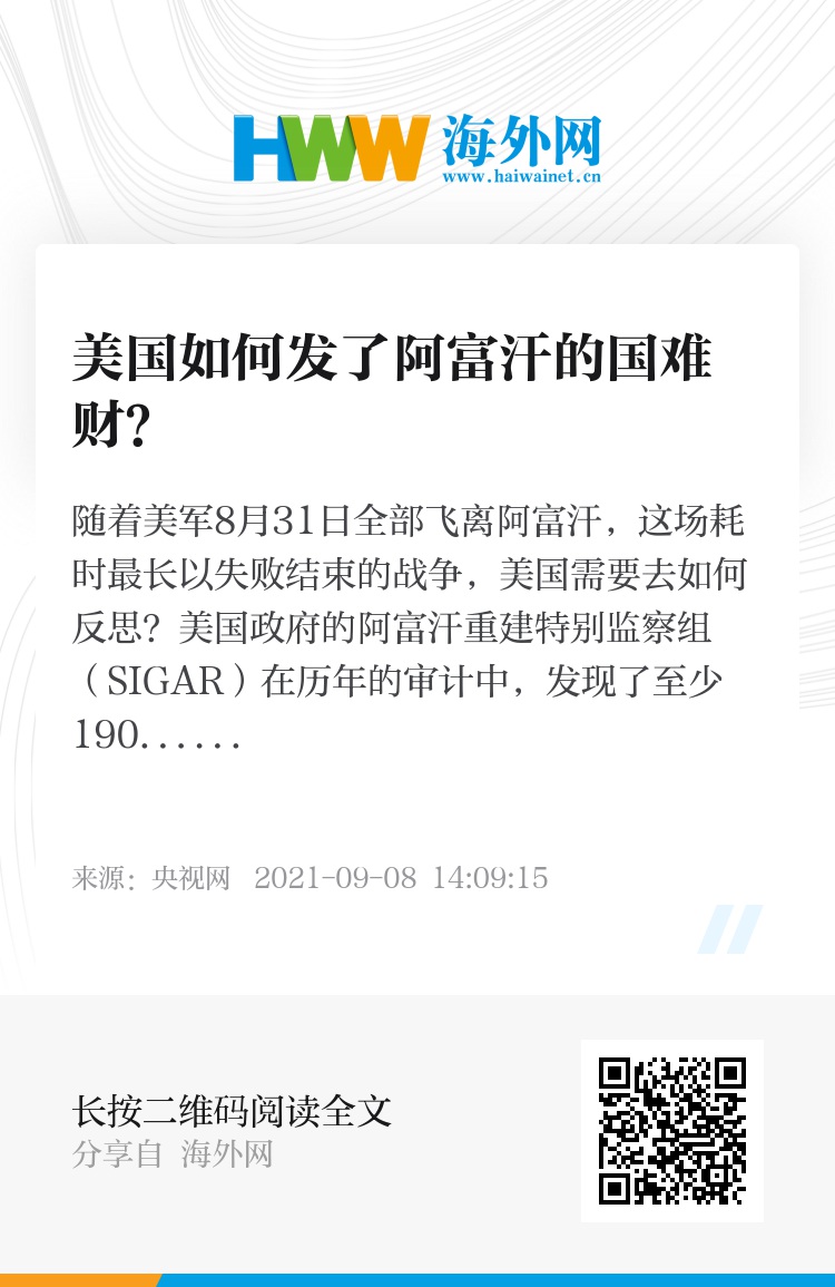 《外交政策》一文的结尾,作者依然在为美国政府找补,声称是美国对巴基斯坦的绥靖政策,才导致了阿富汗变成“当代伊斯兰恐怖组织”的活动基地,因此美国政府要怪,只能怪自己。明面上在责备美国,实际还是把锅甩给了巴基斯坦。然而,从该文中的事实论据,以及国会审计部门、外部媒体、非政府组织等多方公开报道,人们看到的是一派在占领区肆意妄为的情景。上到军方和大企业,小到士官和有门路的个人,无不想在千疮百孔的阿富汗国土上,用尽各种“合法”与非法手段,吸食着阿富汗人的财富和美国纳税人的血汗钱。正如《纽约时报》报道中,那名国际援助部队官员所言:是美国政府和企业在当地的乱作为,激起了民愤,导致“叛乱”的火苗屡禁不绝。随着美军在阿富汗20年经营的草草收场,数万亿美金的水漂付之东流。这场失败需要从美国自身找原因,而非怪罪于其它因素。可惜的是,敢于自我批评和反省的政客,以及能切中要害、有担当的学者,能为政府对外政策纠错的舆论,在当下的美国,可谓凤毛麟角。而阿富汗也只有真正走上独立自主的道路,才会迎来硝烟散尽的曙光。(央视记者 景肇)
