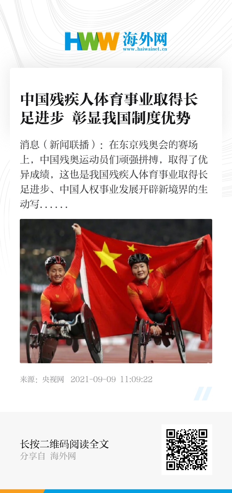 央视网消息(新闻联播):在东京残奥会的赛场上,中国残奥运动员们顽强拼搏,取得了优异成绩,这也是我国残疾人体育事业取得长足进步、中国人权事业发展开辟新境界的生动写照。