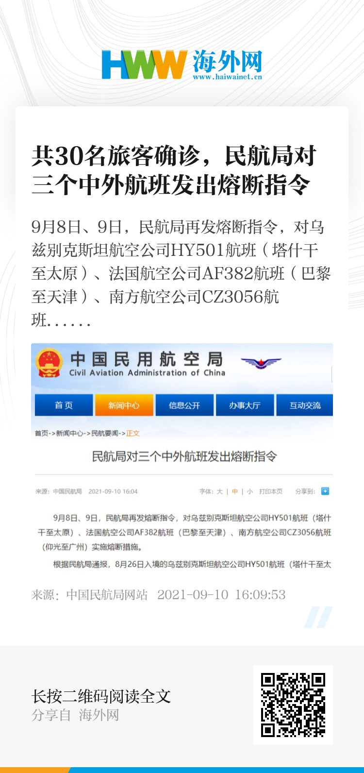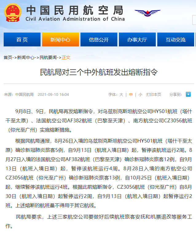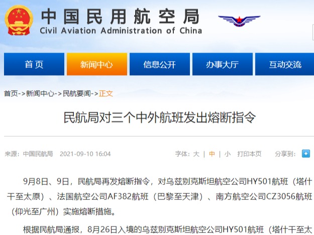 9月8日、9日,民航局再发熔断指令,对乌兹别克斯坦航空公司HY501航班(塔什干至太原)、法国航空公司AF382航班(巴黎至天津)、南方航空公司CZ3056航班(仰光至广州)实施熔断措施。