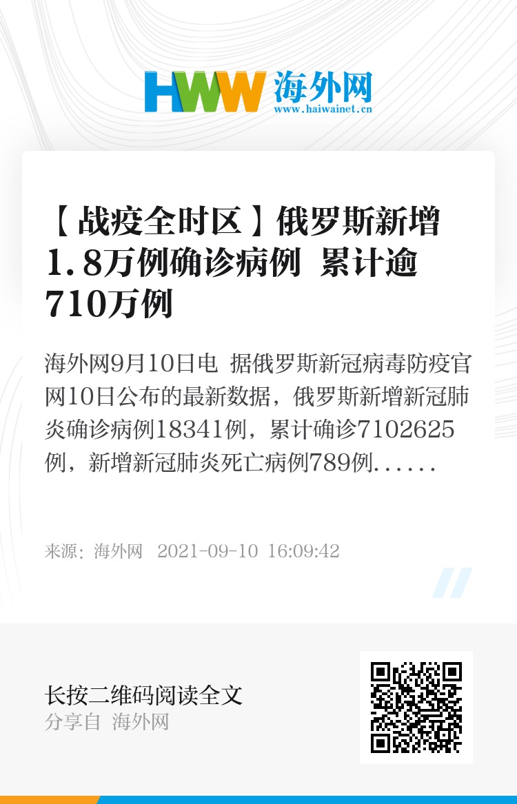 海外网9月10日电 据俄罗斯新冠病毒防疫官网10日公布的最新数据,俄罗斯新增新冠肺炎确诊病例18341例,累计确诊7102625例,新增新冠肺炎死亡病例789例,累计死亡191165例。(海外网 张琪)