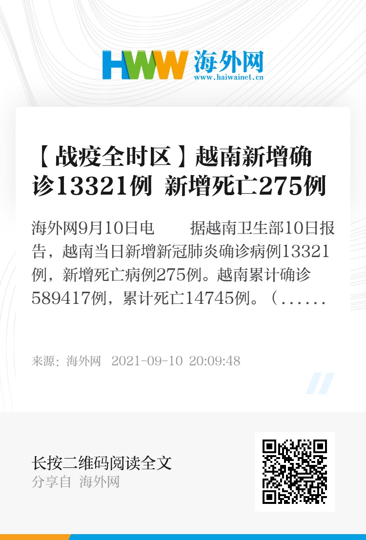 海外网9月10日电 据越南卫生部10日报告,越南当日新增新冠肺炎确诊病例13321例,新增死亡病例275例。越南累计确诊589417例,累计死亡14745例。(海外网 李芳)