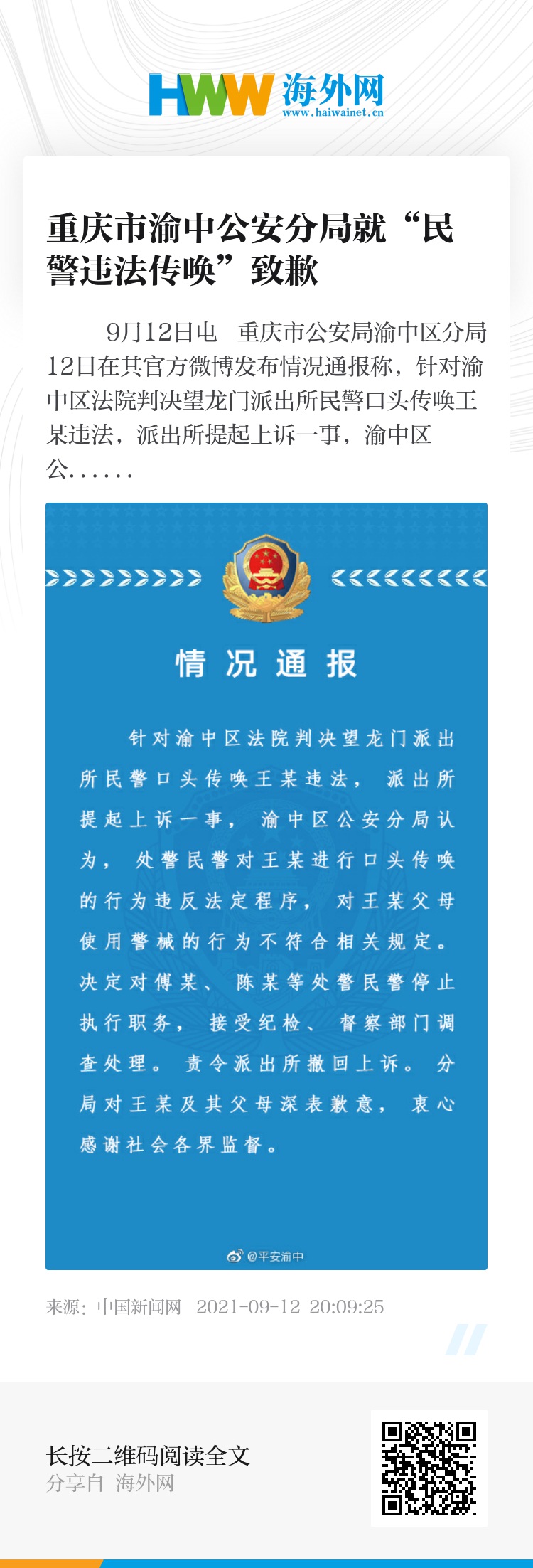 中新网9月12日电 重庆市公安局渝中区分局12日在其官方微博发布情况通报称,针对渝中区法院判决望龙门派出所民警口头传唤王某违法,派出所提起上诉一事,渝中区公安分局对王某及其父母深表歉意,责令派出所撤回上诉。