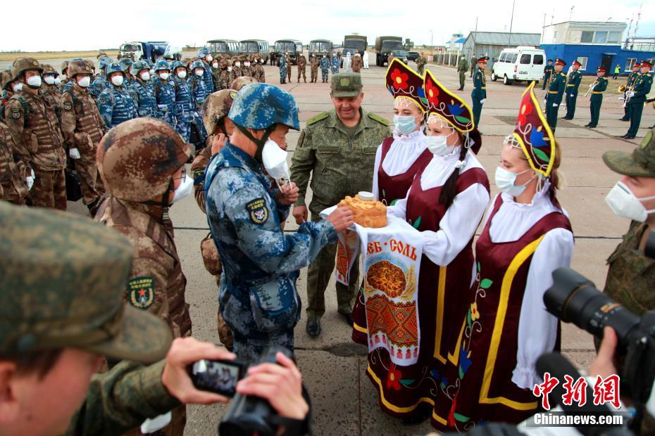 当地时间9月10日,“和平使命-2021”联合军演中方参演部队导演部抵达俄罗斯奥伦堡“东古兹”靶场演习地域。图为俄方人员为中方人员举行欢迎仪式。 中新社记者 李纯 摄