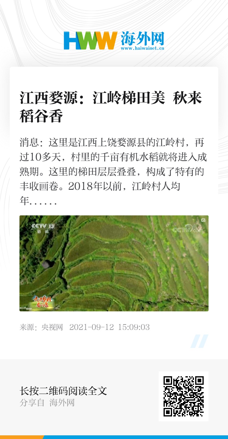央视网消息:这里是江西上饶婺源县的江岭村,再过10多天,村里的千亩有机水稻就将进入成熟期。这里的梯田层层叠叠,构成了特有的丰收画卷。2018年以前,江岭村人均年收入还只有800元,村里的年轻人大都选择外出打工,导致大面积农田荒废。近年来,当地利用独特的地貌资源发展旅游,春赏油菜夏看稻田,越来越多的年轻人回到村里创业,村民人均收入超过15000元。