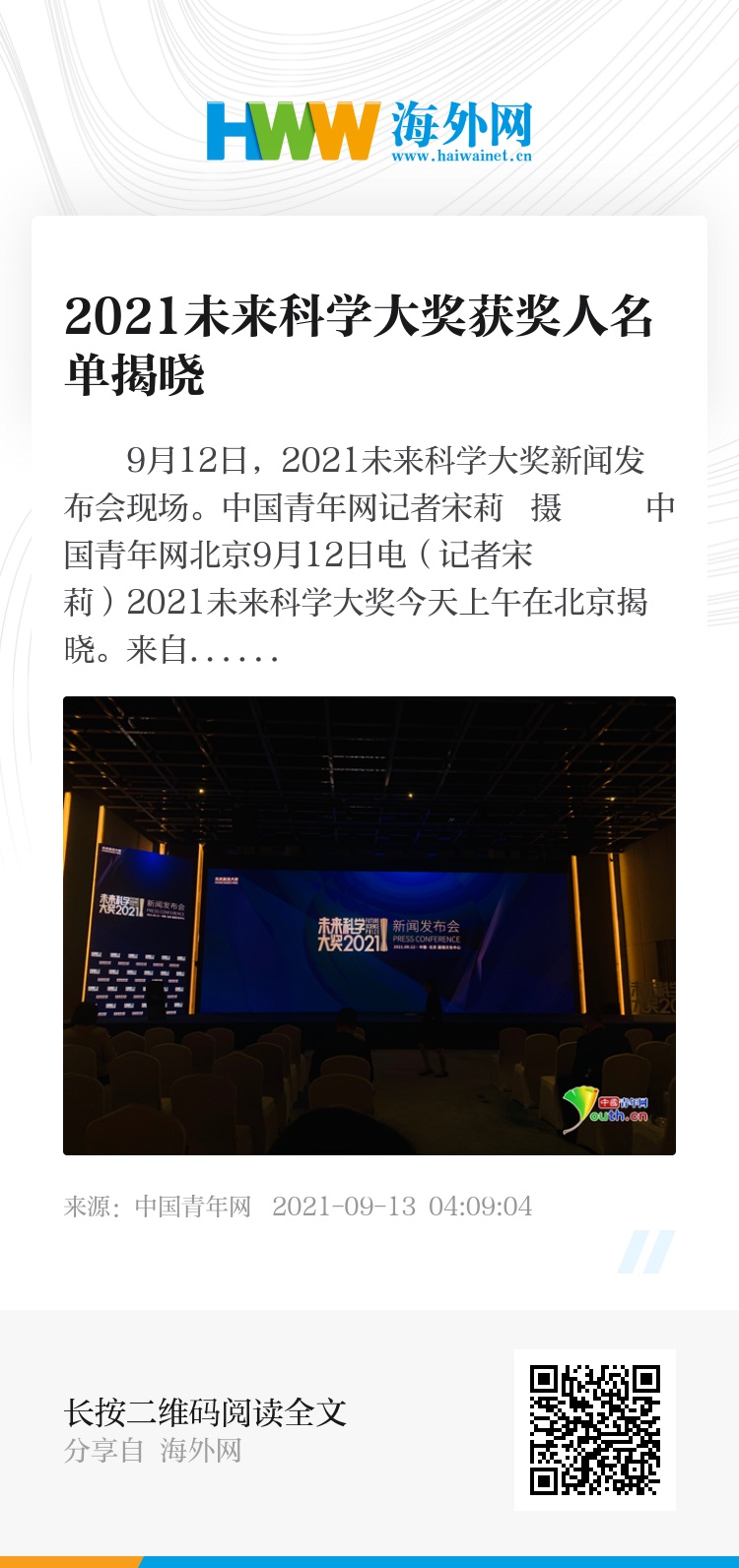 未来科学大奖设立于2016年,是中国大陆第一个由科学家、企业家群体共同发起的民间科学奖项,主要奖励为大中华区科学发展做出杰出科技成果的科学家,设生命科学奖、物质科学奖、数学与计算机科学奖等三大奖项,单项奖金为一百万美元(人民币约650万元)。