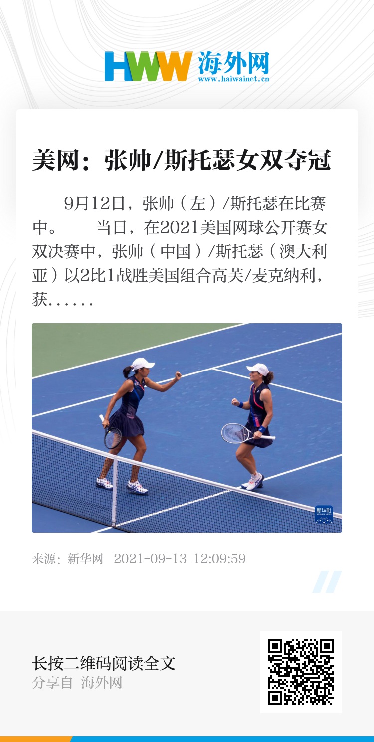 当日,在2021美国网球公开赛女双决赛中,张帅(中国)/斯托瑟(澳大利亚)以2比1战胜美国组合高芙/麦克纳利,获得冠军。