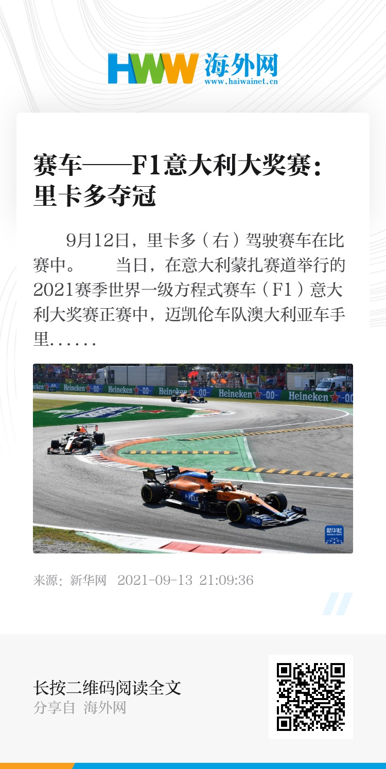 当日,在意大利蒙扎赛道举行的2021赛季世界一级方程式赛车(F1)意大利大奖赛正赛中,迈凯伦车队澳大利亚车手里卡多和英国车手诺里斯分获冠亚军,梅赛德斯车队芬兰车手博塔斯获得季军。