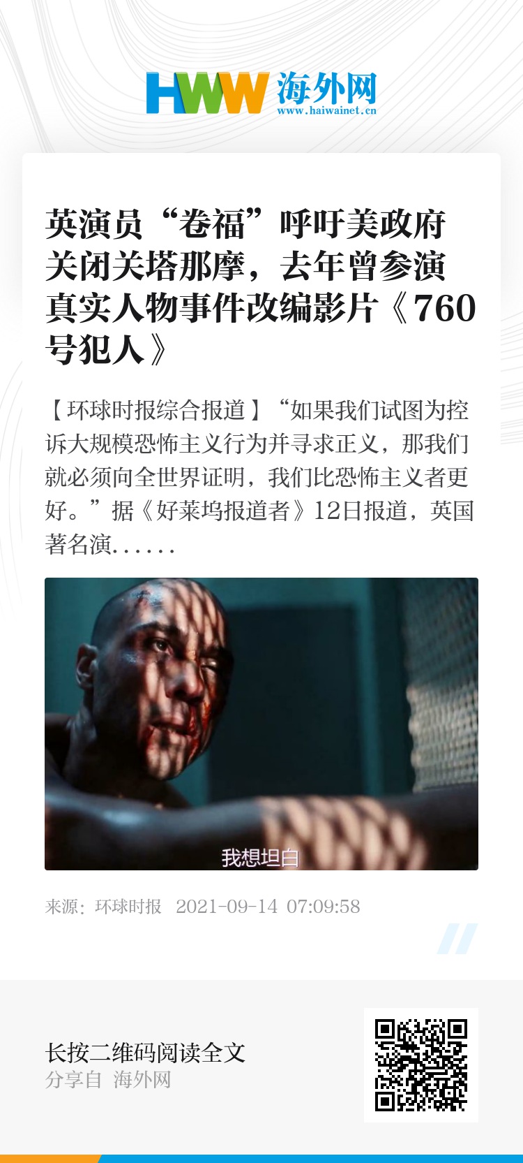 这位被中国影迷们昵称为“卷福”、凭借《神探夏洛特》和《奇异博士》走红的英国演员,去年曾参与出演基于真实人物和事件的影片《760号犯人》。该片根据震惊世界的回忆录《关塔那摩日记》改编,讲述一名“嫌犯”因被怀疑与“9·11”恐袭有关,被美军关进关塔那摩监狱,经历长达14年的折磨之后,终于在朱迪·福斯特饰演的律师和康伯巴奇饰演的军官帮助下,把幕后真相公之于众。康伯巴奇认为,“9·11”恐袭悲剧造成“粗糙的正义,脱离了任何可接受的程序标准,让影片主人公穆罕默德·斯拉希在关塔那摩遭受错误的起诉和不公正的监禁”。其实“卷福”早在去年就曾呼吁拜登尽快关闭关塔那摩美军监狱,并希望美国政府理清恐怖主义和关塔那摩监狱之间的关系。