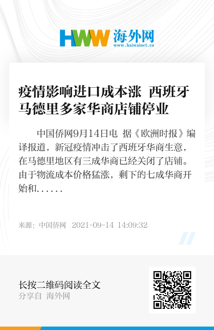 中国侨网9月14日电 据《欧洲时报》编译报道,新冠疫情冲击了西班牙华商生意,在马德里地区有三成华商已经关闭了店铺。由于物流成本价格猛涨,剩下的七成华商开始和西班牙当地供货商合作。
