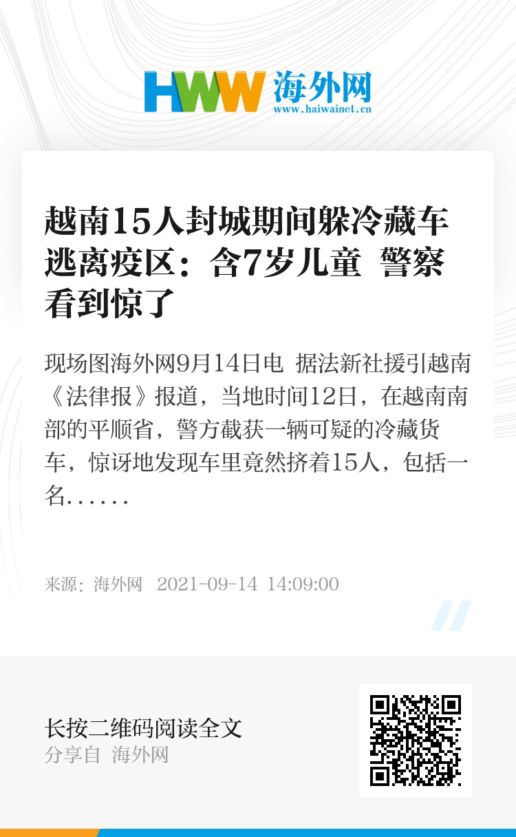 海外网9月14日电 据法新社援引越南《法律报》报道,当地时间12日,在越南南部的平顺省,警方截获一辆可疑的冷藏货车,惊讶地发现车里竟然挤着15人,包括一名7岁的男童。