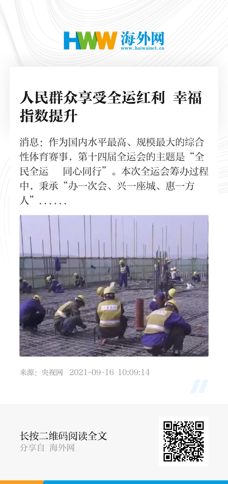 央视网消息:作为国内水平最高、规模最大的综合性体育赛事,第十四届全运会的主题是“全民全运 同心同行”。本次全运会筹办过程中,秉承“办一次会、兴一座城、惠一方人”,让人民群众享受全运红利,提高群众的幸福指数。