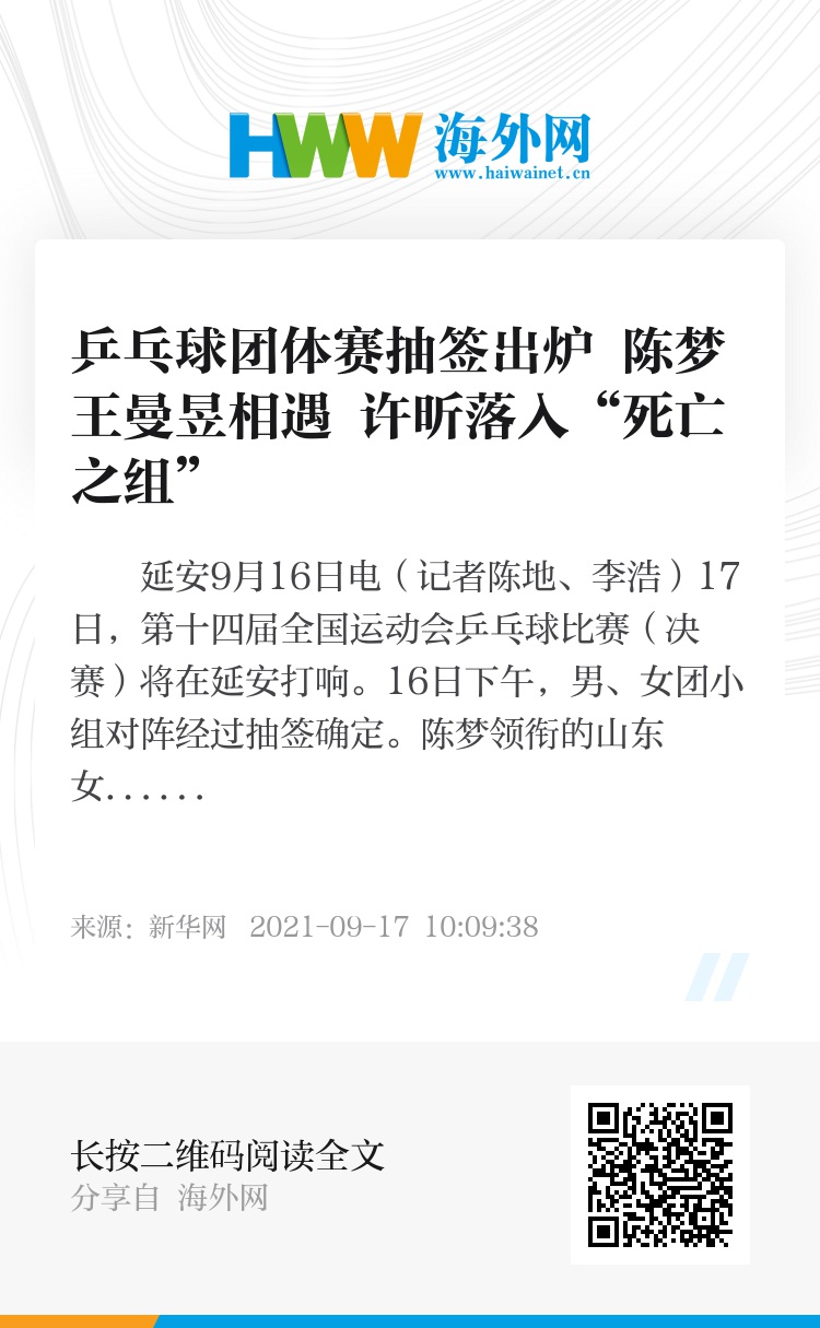 新华社延安9月16日电(记者陈地、李浩)17日,第十四届全国运动会乒乓球比赛(决赛)将在延安打响。16日下午,男、女团小组对阵经过抽签确定。陈梦领衔的山东女团将遭遇王曼昱领衔的黑龙江女团,而许昕领衔的上海队则落入“死亡之组”。