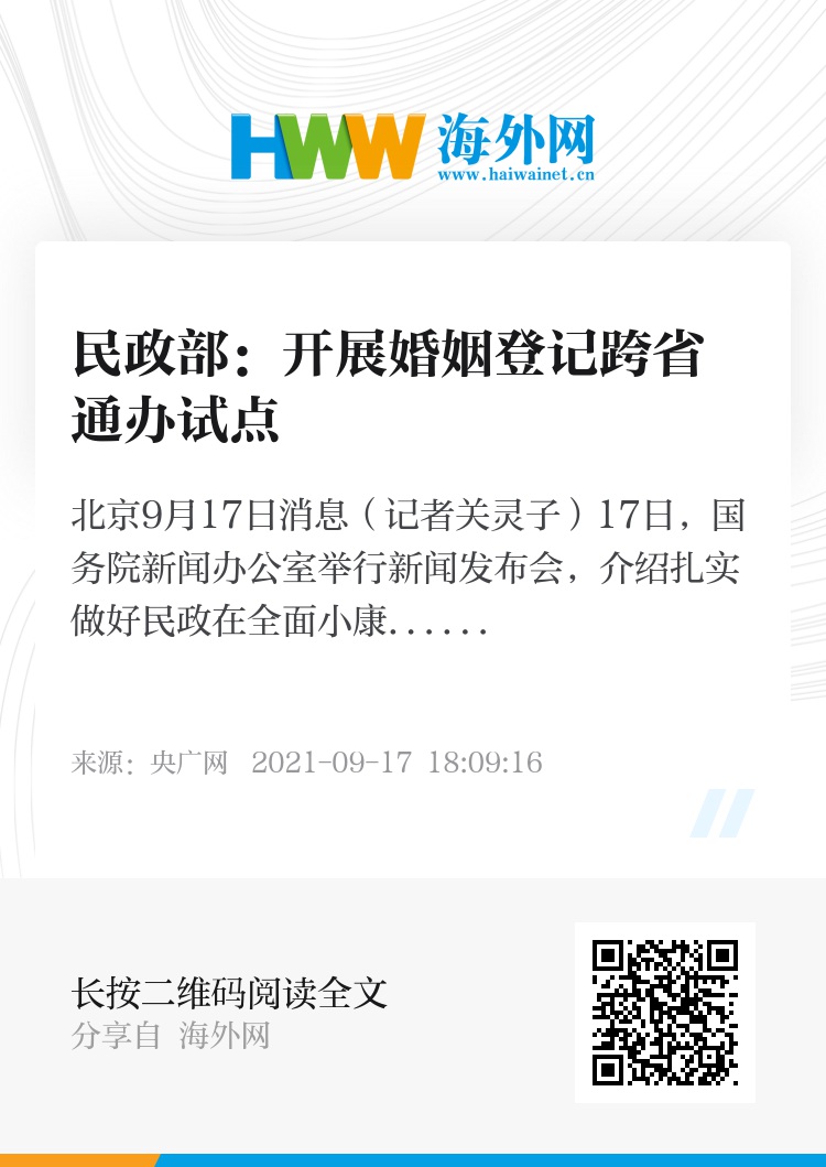 三是开展婚姻登记的跨省通办试点,方便老百姓办事。这项试点是从今年6月1日起,在全国七个省、两个省会城市开始,从6月1日-8月31日,各试点地区共办理跨省婚姻登记9703对,其中结婚登记8143对、离婚登记1560对,有效满足了群众需要。